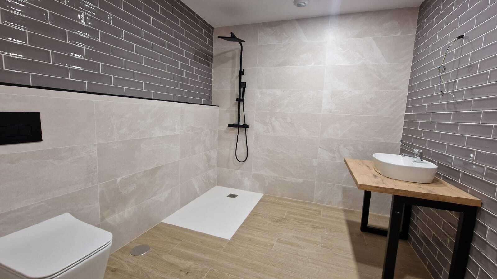 Baños accesibles, con duchas a ras de suelo e inodoros suspendidos, pensados para el confort y la funcionalidad.